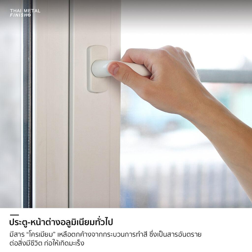 การใช้งานดีและดีไซน์ที่สวยงาม ไทยเม็ททอลยังคำนึงถึงเรื่องของความปลอดภัยของผู้ใช้งานในระยะยาวด้วย เพราะโดยปกติ บานประตู-หน้าต่างอลูมิเนียมทั่วไปนั้นจะมีการใช้ “โครเมียม” เป็นส่วนประกอบในขั้นตอนการเตรียมผิวอลูมิเนียมให้สีติดทนนาน ซึ่งโครเมียมจัดเป็น “สารอันตรายที่ก่อให้เกิดมะเร็ง” (Carcinogencity) ที่ได้รับการวิจัยจากสถาบันวิจัยมะเร็งสากล (IARC)